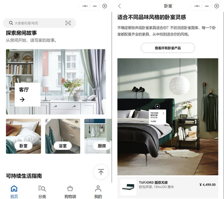 在「IKEA 宜家家居」上,宜家也没有把它的「灵魂」给落下,小程序里的「探索房间故事」模块就像是浓缩版的线上样板间。