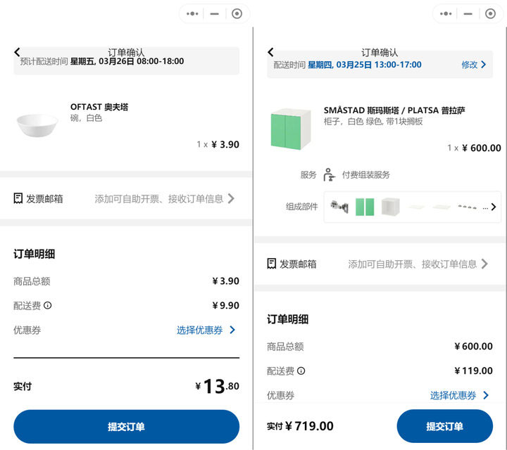 微信小程序购物支持全国 227 个省市地区范围配送,提供送货上门、安装、退货等服务,并根据所在的城市和省份有无宜家商场的情况,大件商品的运费会有不同。